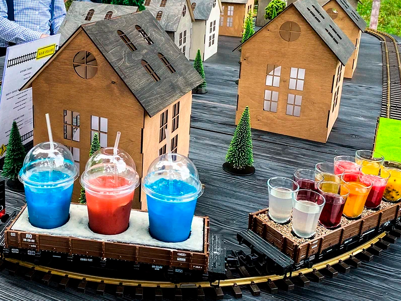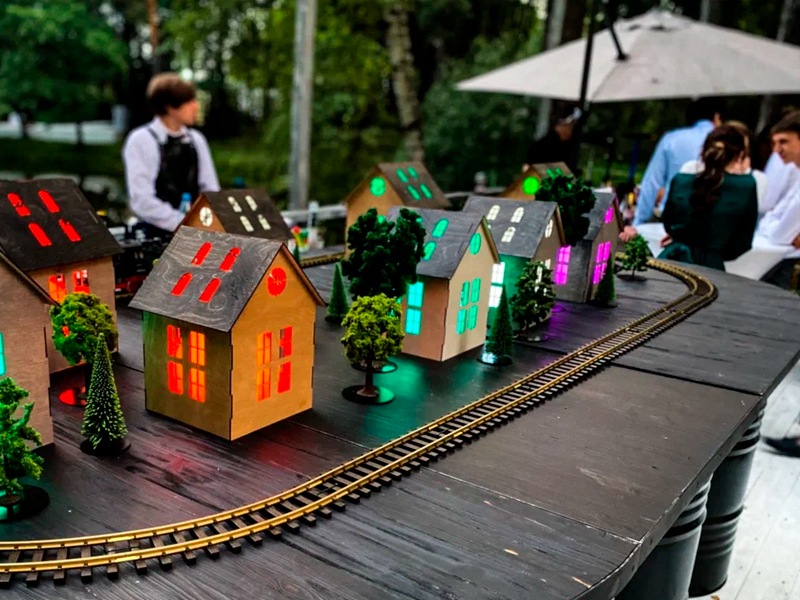 Подача напитков и закусок в небольших движущихся вагончиках точно привлечёт внимание и заворожит гостей Вашего выездного мероприятия! Предлагаем Вам необычный бар с железной дорогой, который сможет удивить всех не только необычной подачей, но и восхитительными авторскими или классическими коктейлями. Поезд, дым, стук колёс, светящиеся домики - всё это Вы можете заказать у нас в аренду!