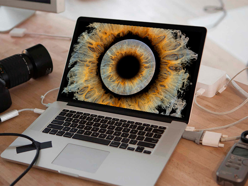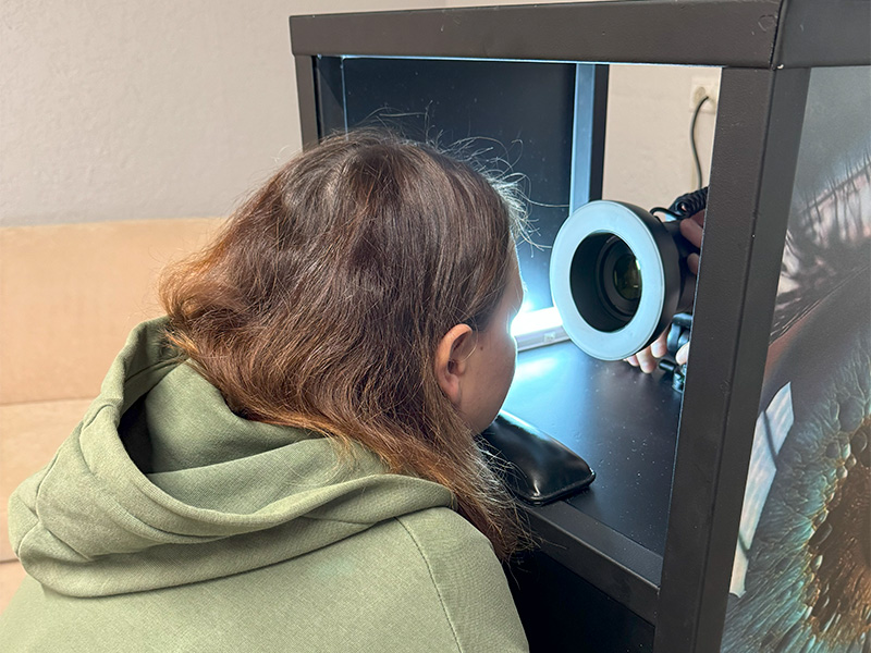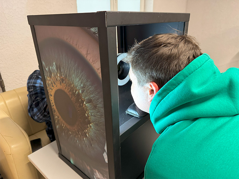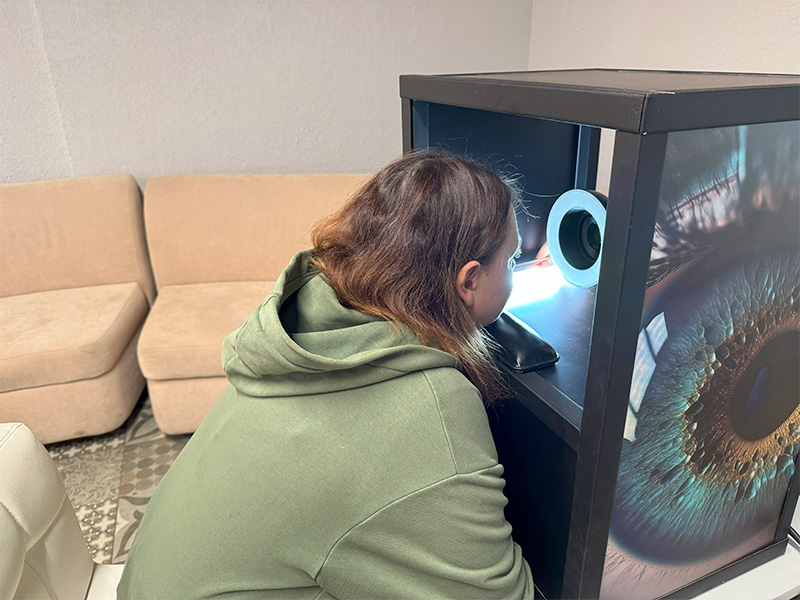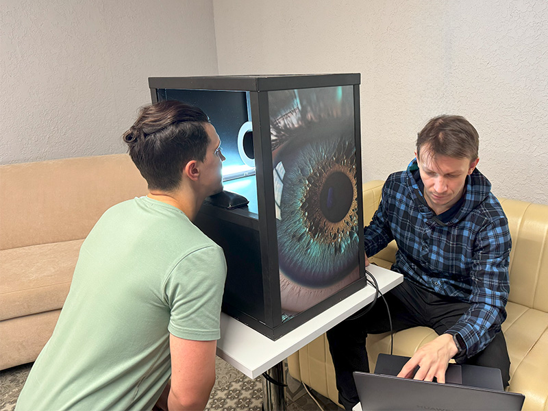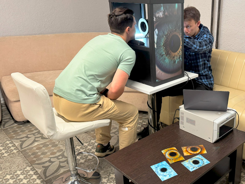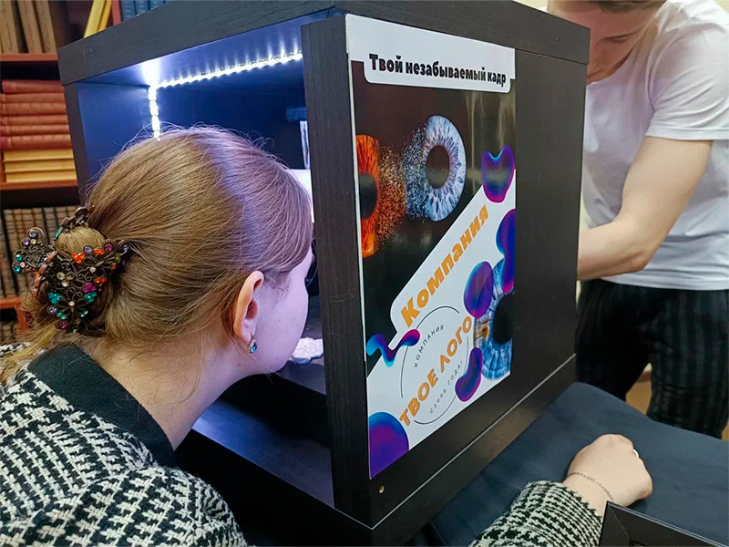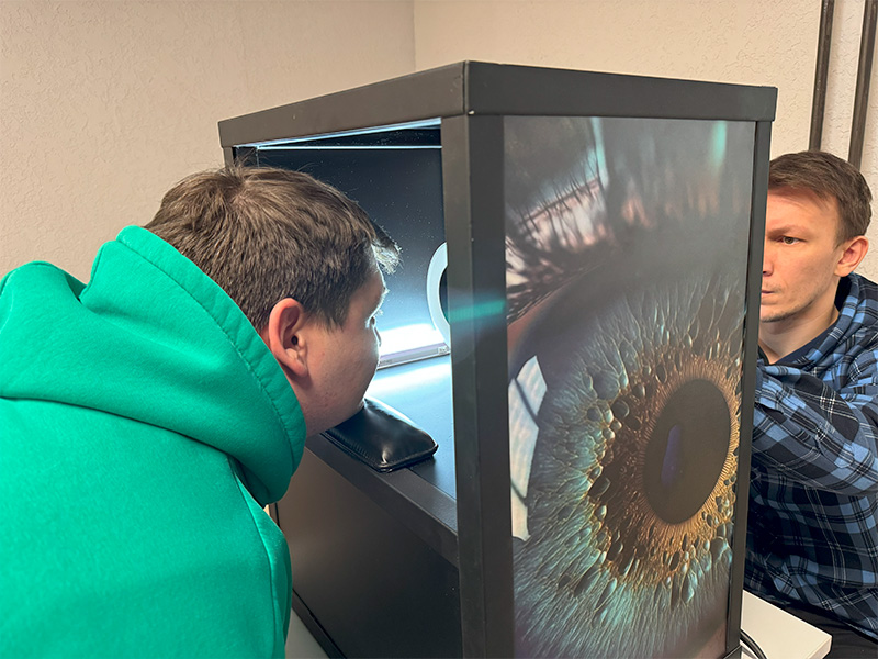 Гость подходит к специальной стойке, где профессиональная камера производит высококачественную макрофотографию глаза с детализацией радужки