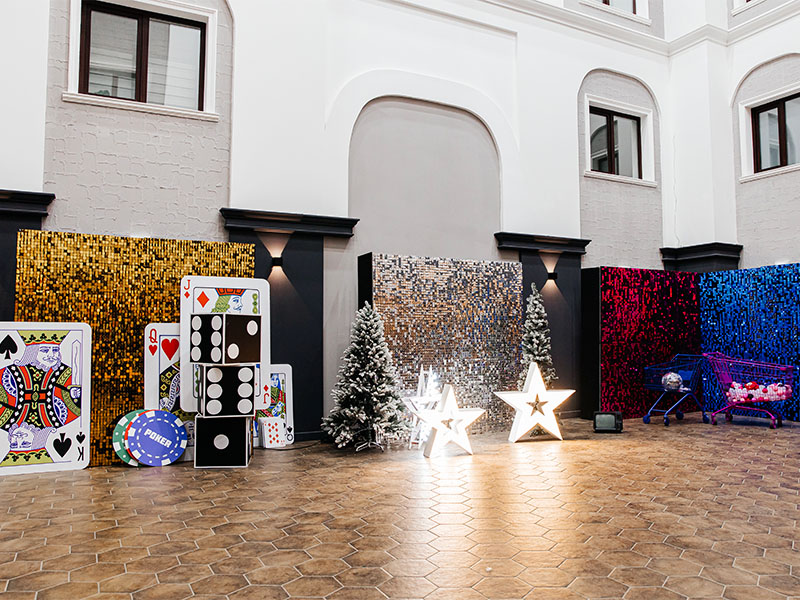 У нас доступны динамичные анимированные фотозоны с использованием современных технологий. У нас вы можете заказать оформление декора с золотыми элементами на день рождения, свадьбу или любое другое торжество. Если хотите заказать большие новогодние фотозоны в Москве, у нас есть все необходимое для этого.