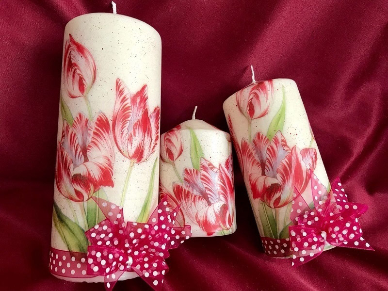 - Свечи: принцип работы аналогичен технике декупажа досок, но салфетка переносится на свечку с помощью ложки, нагретой от свечи.