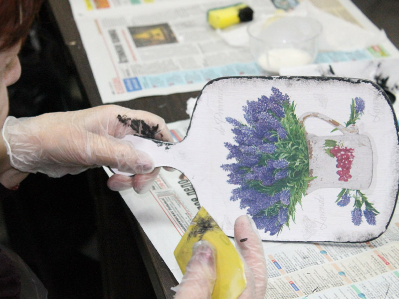- Доски: основой для декупажа служит деревянная заготовка кухонной доски. После того, как загрунтована вся поверхность, участники выбирают понравившийся мотив в салфетках, декупажных картах и переносят его на доску с помощью клея. Далее заготовке необходимо подсохнуть; при желании можно добавить яркости заготовке с помощью контурной краски, блесток. Закрепляем лаком.