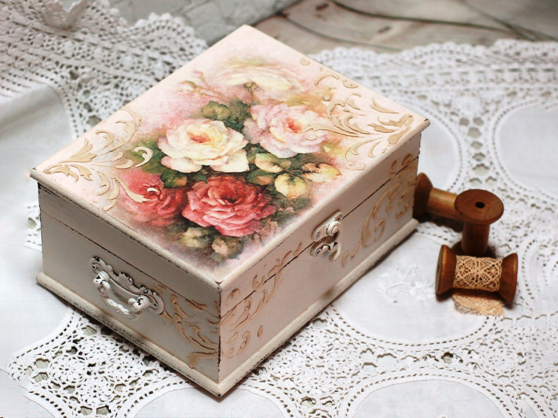 - Шкатулок: принцип работы аналогичен технике декупажа досок, но работа более долгая и интересная, так как шкатулка — это не плоский, а многогранный предмет, что позволяет дать более широкий простор для творчества.